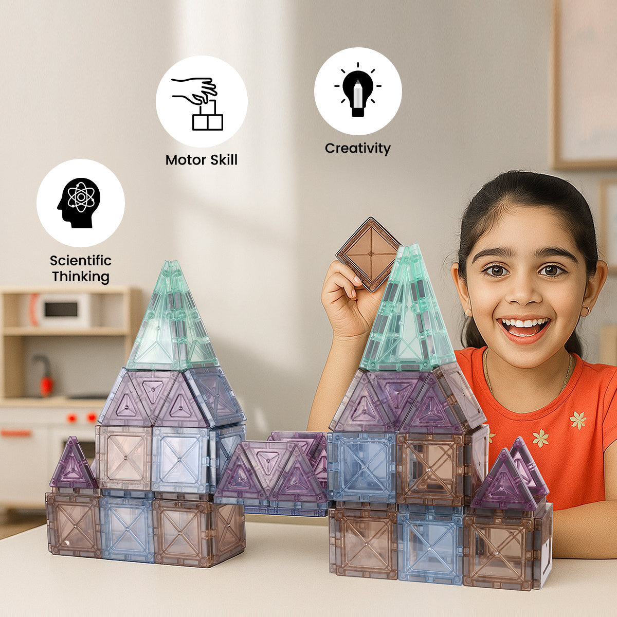 Our Magnetic Tiles set is a burst of colour, clicks, and creativity! From cubes to castles, this set grows with your child's imagination.